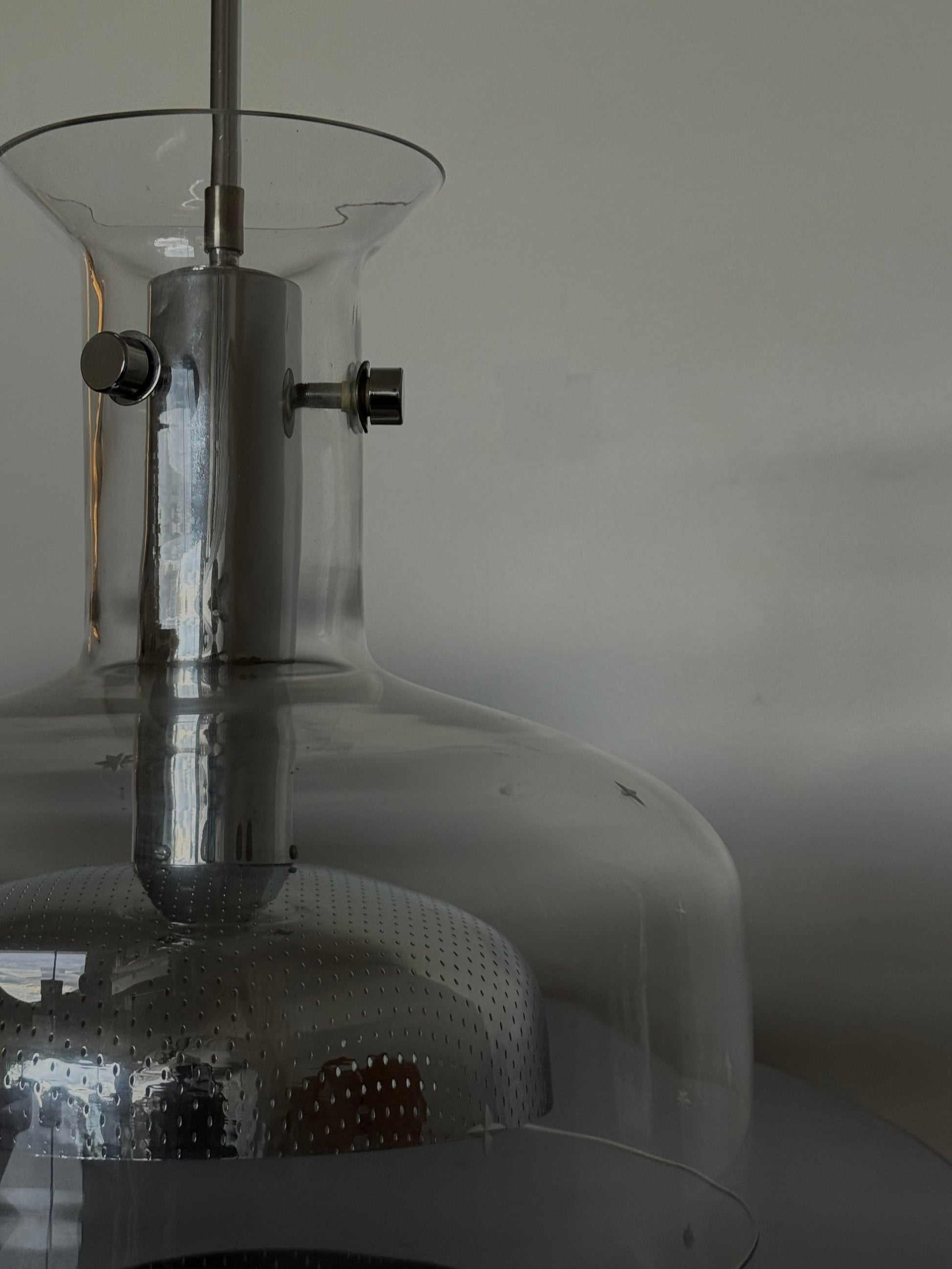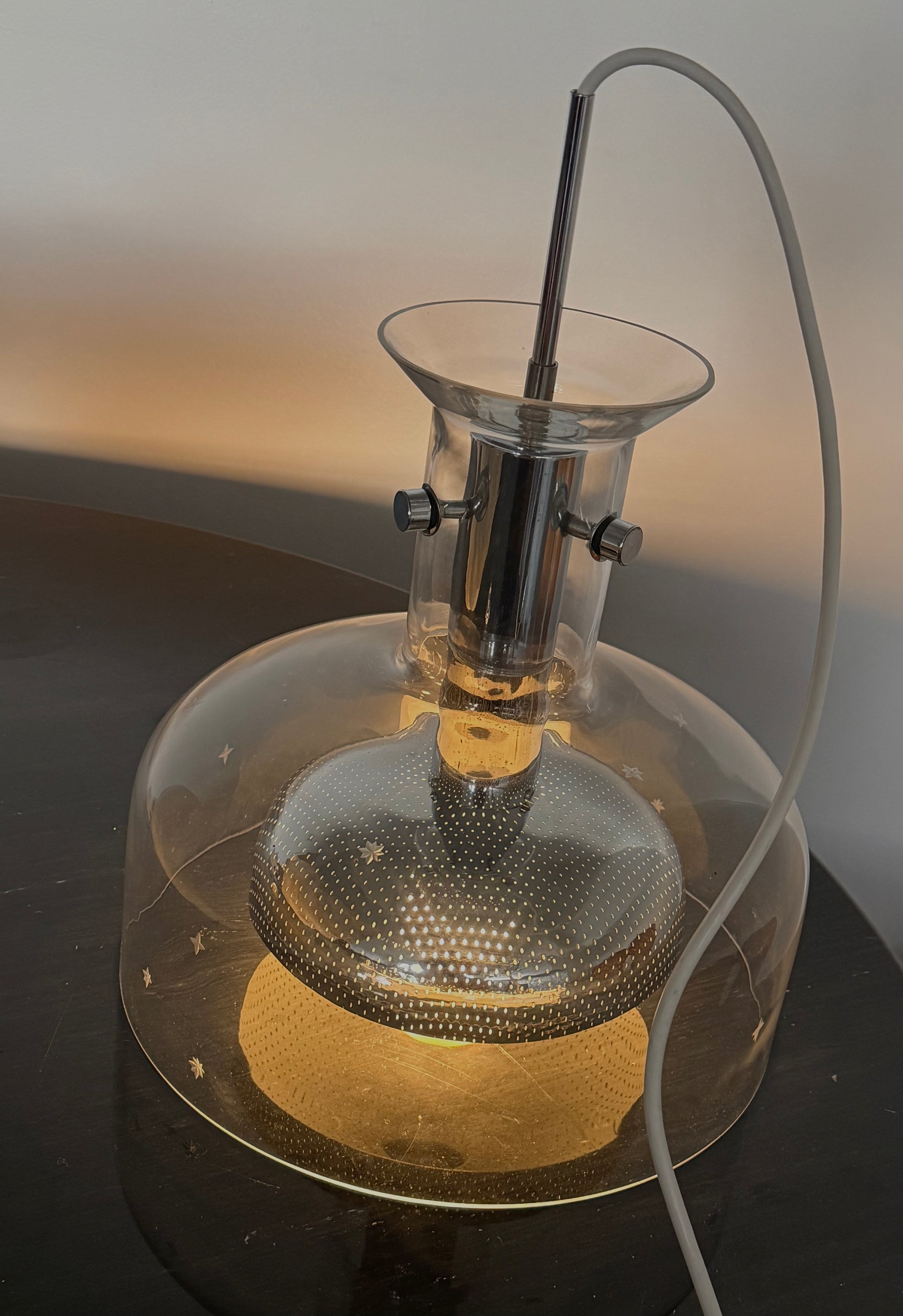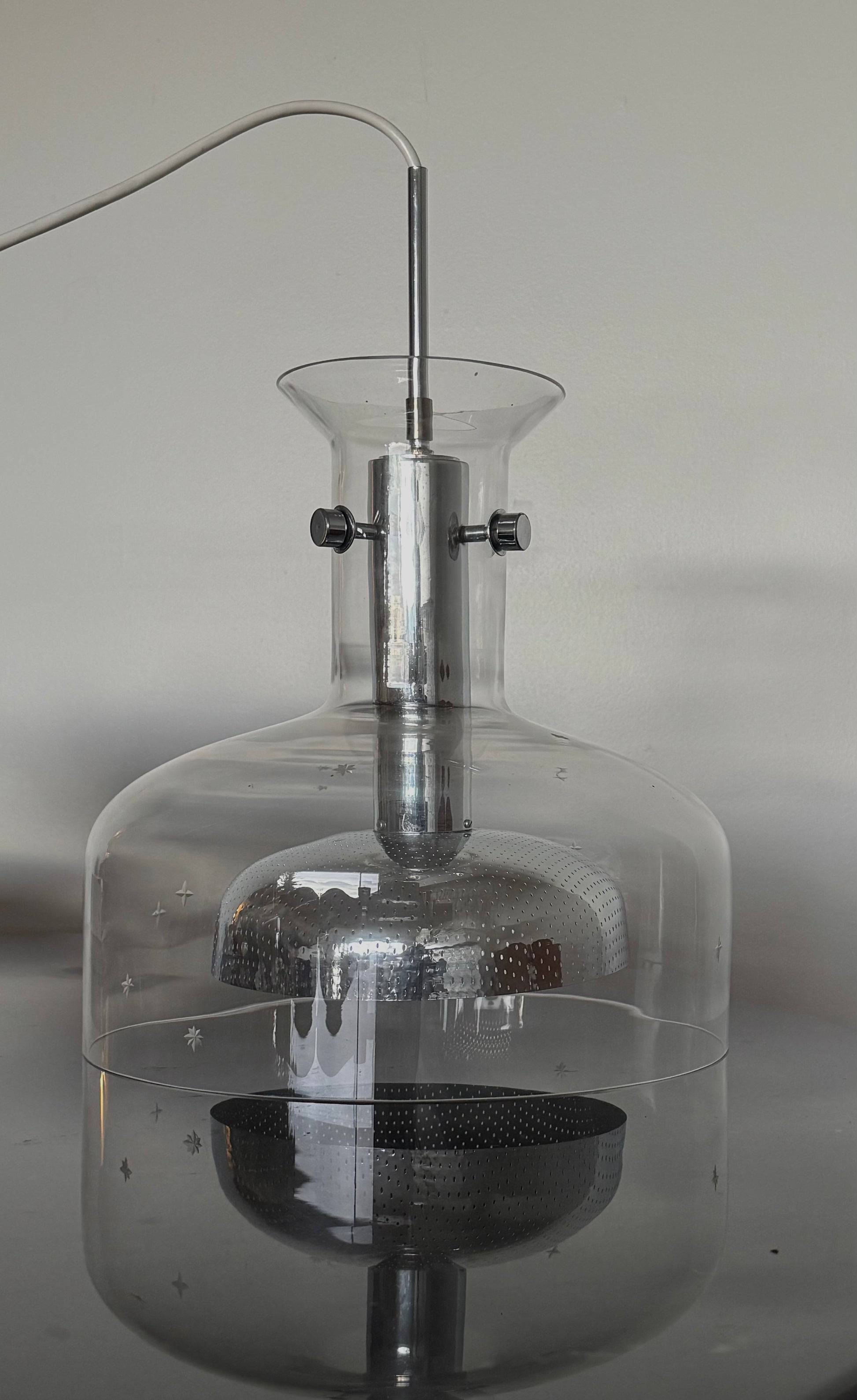 Original 1970s Crystal pendant lamp by Anders Pehrson for Ateljé Lyktan. Features chrome and glass shades with perforated holes for unique light distribution.