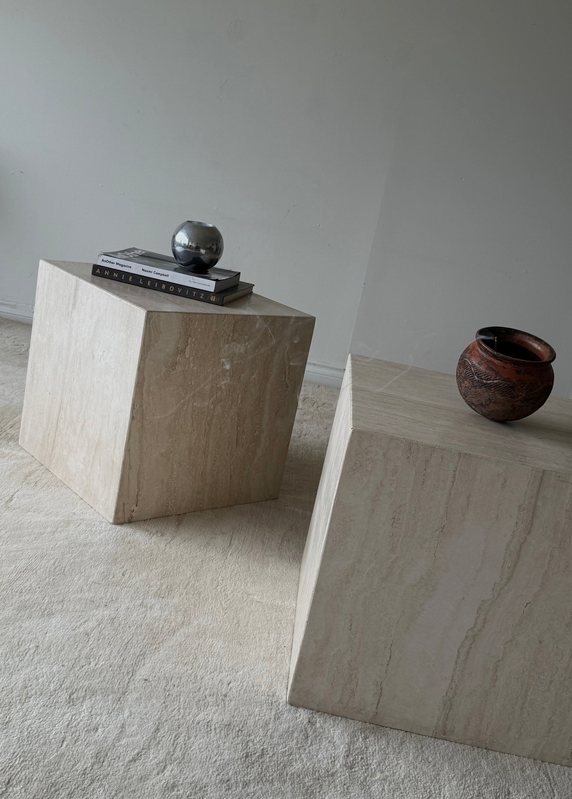 A timeless pair of travertine cubes from 1970s made in Italy. Stamped