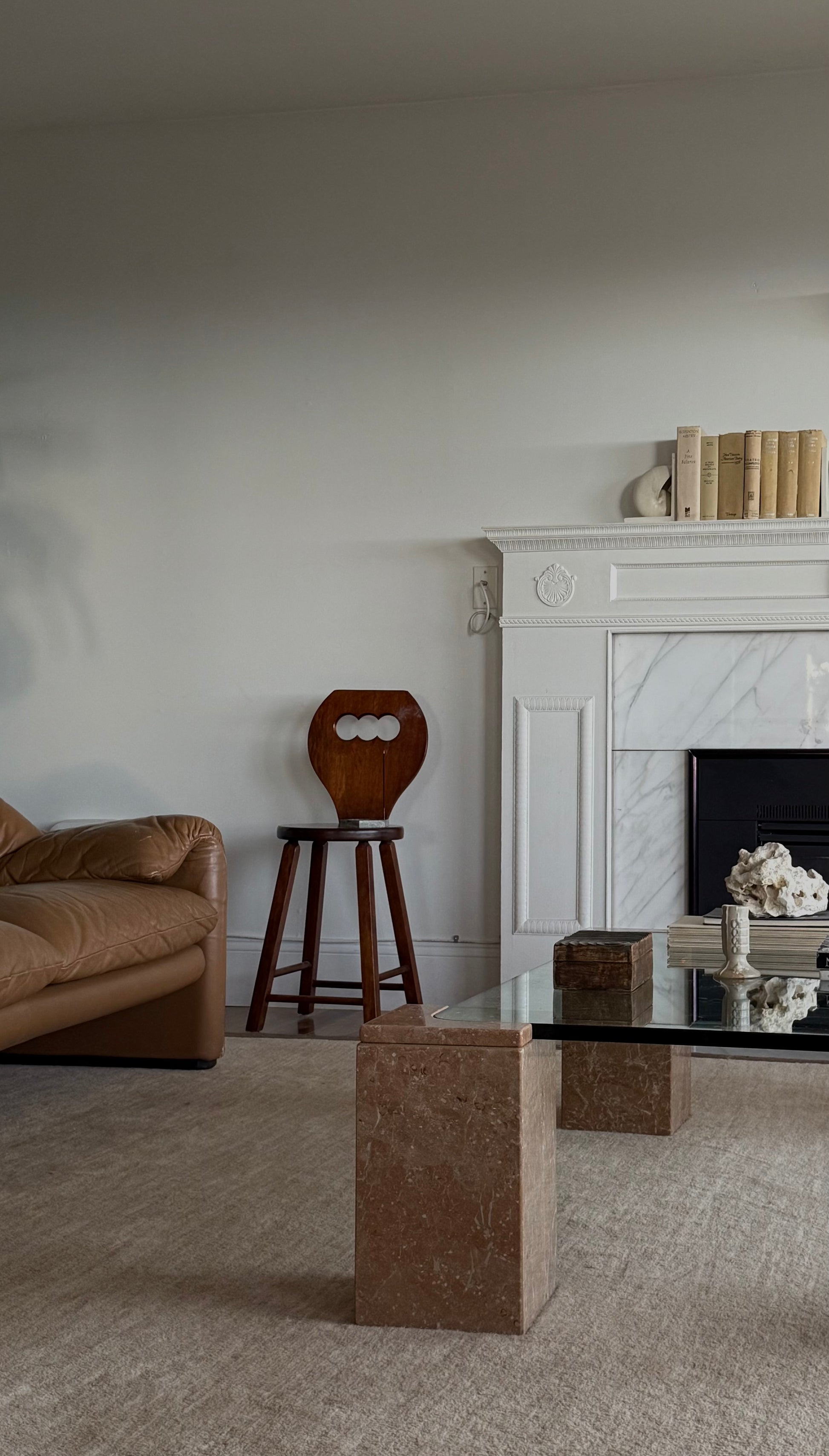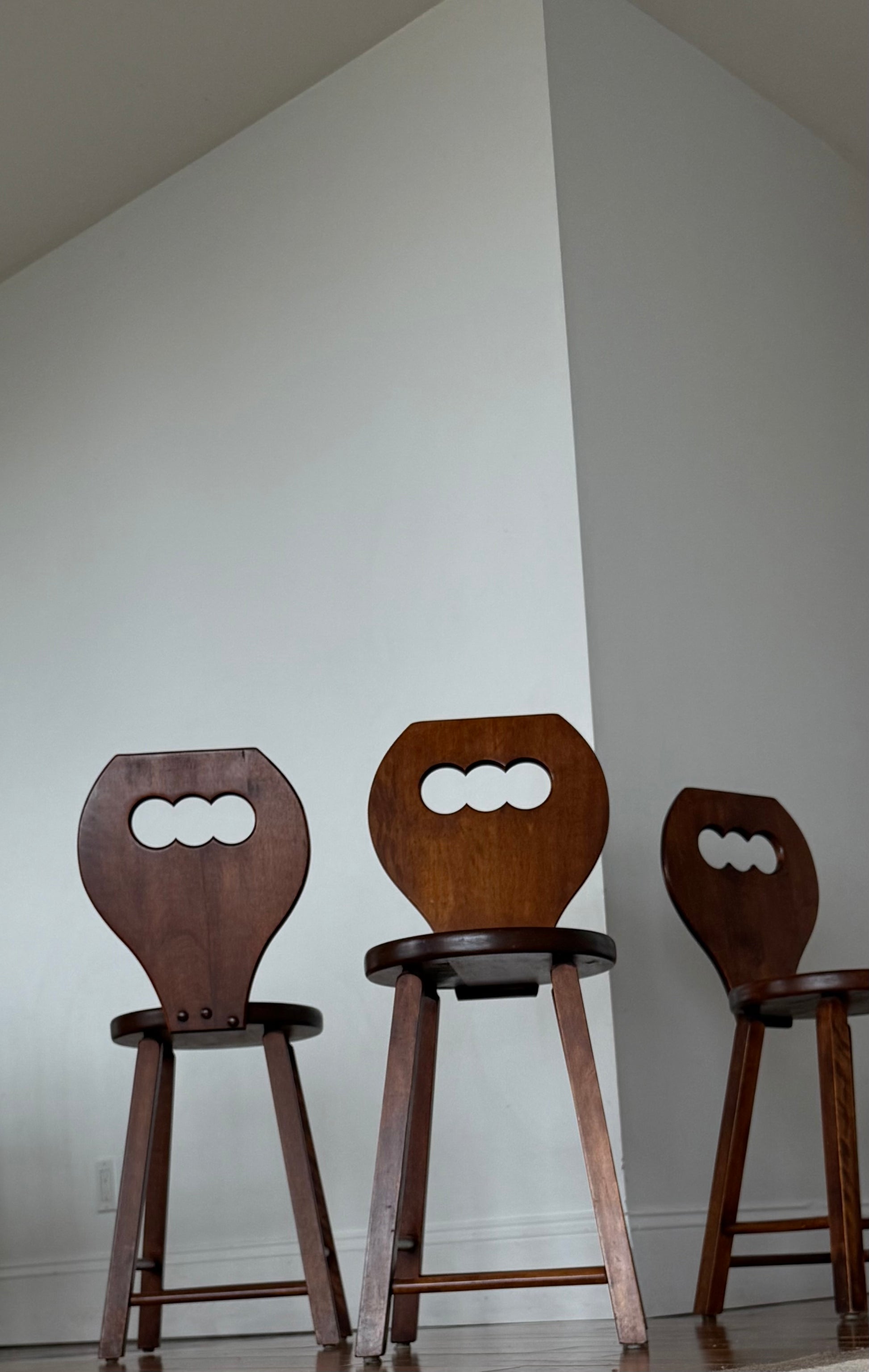Love this set of brutalist dark-stained wooden chairs. Selling as individuals. All three are in perfect condition with very minimal wear from history.