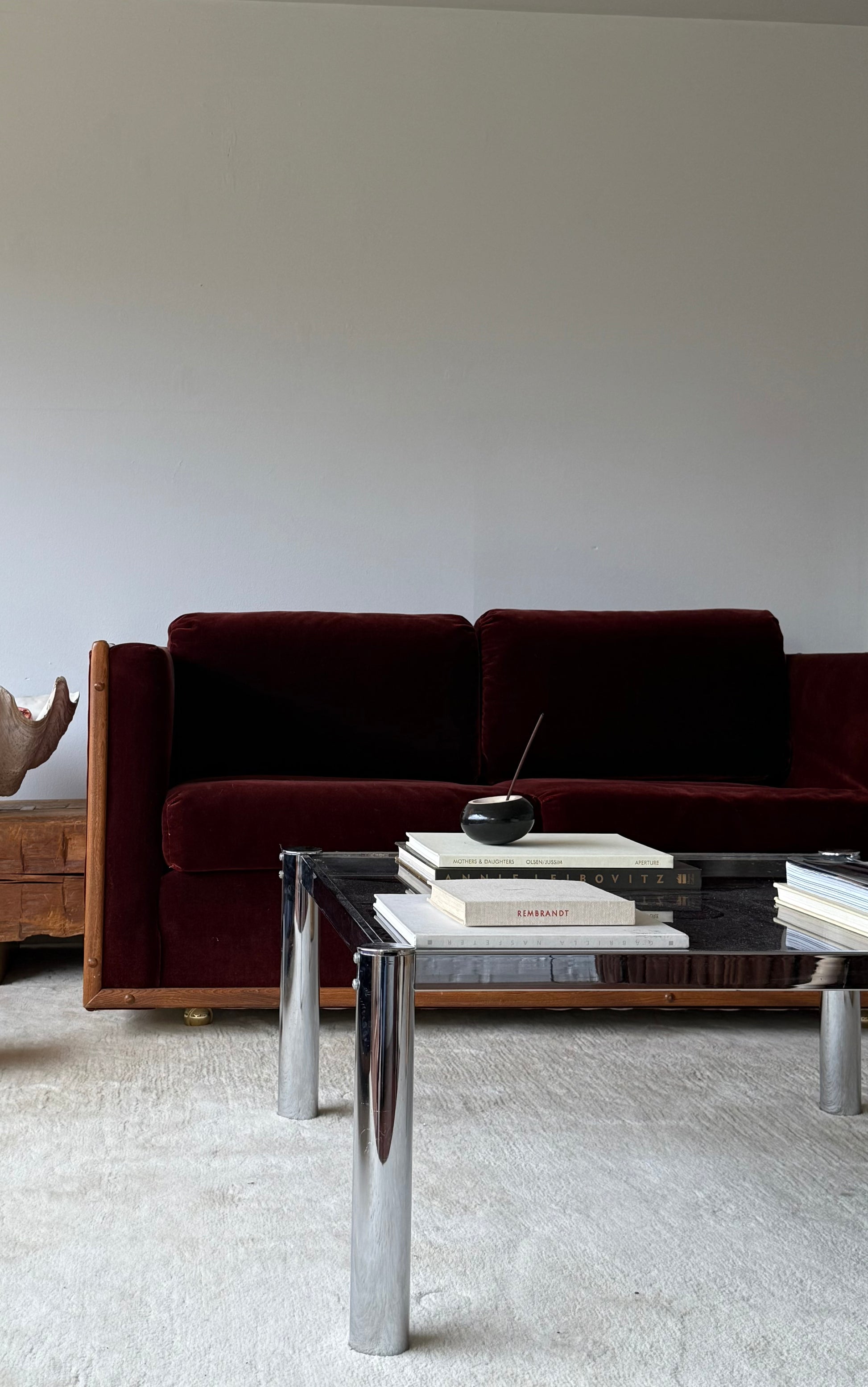 We are highly drawn to the cylindrical legs of this MCM minimalist coffee table, featuring chrome and smoky glass.