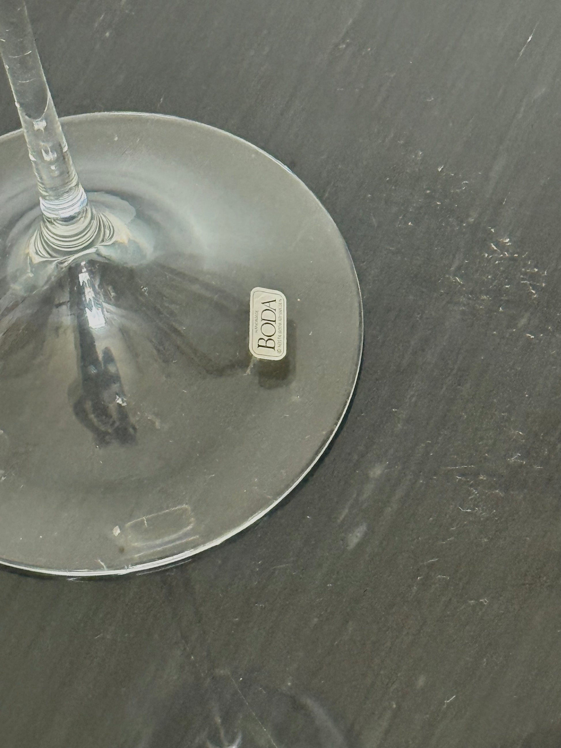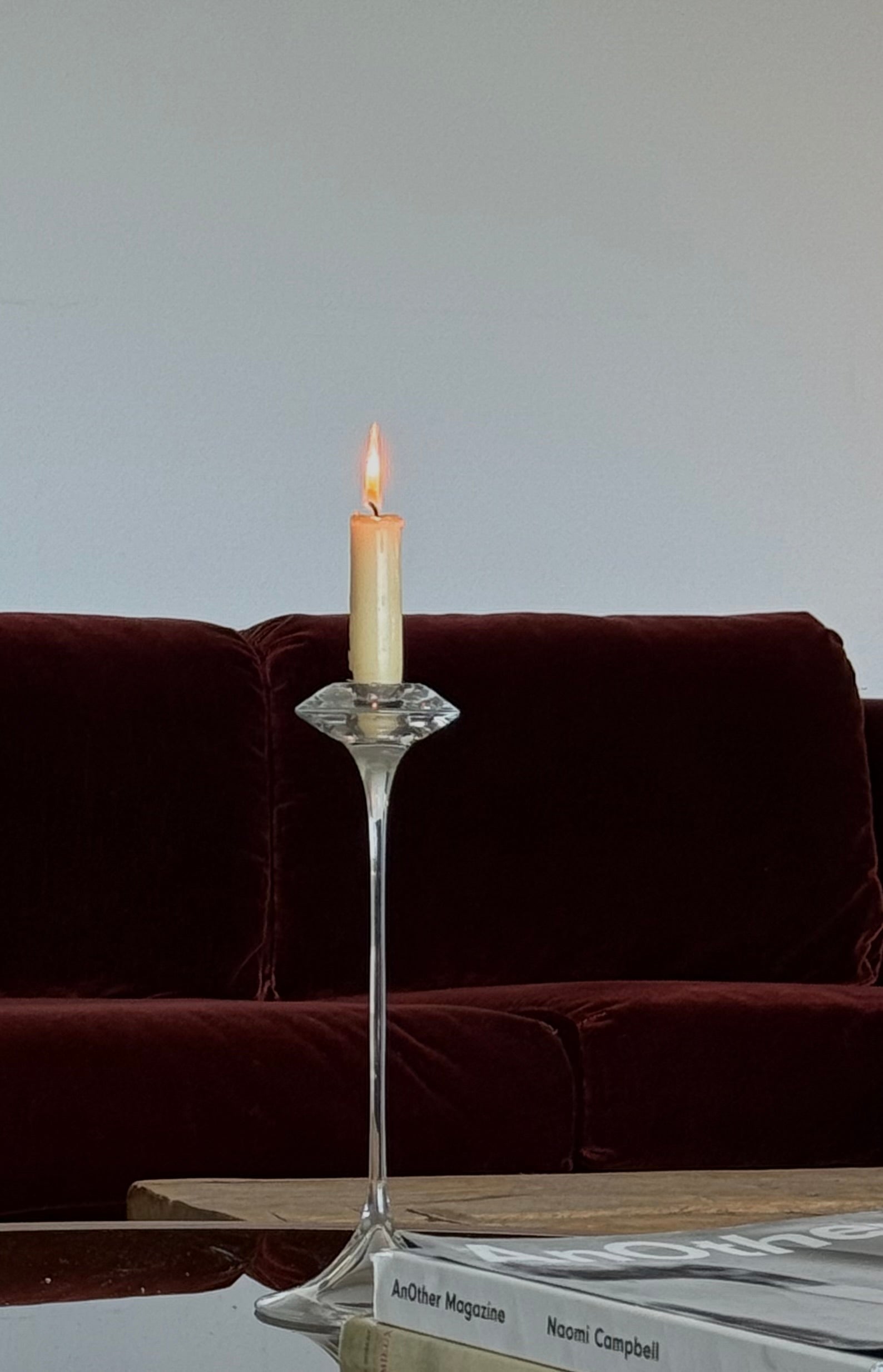 This is a Swedish crystal candlestick holder designed by Kjell Engman in 1989. It is part of the KOSTA BODA Fanfare collection, created for the renowned Swedish glass manufacturer Kosta Boda Glass. The holder is made from clear crystal glass.