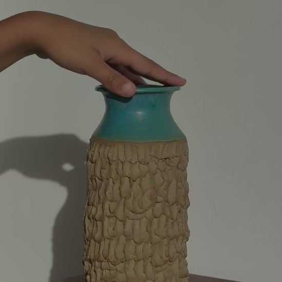 A signed handmade studio potter vase with a textured, scale-like or ruffled surface on the lower body and a smooth, teal-colored glaze around the neck in the style of Gunnar.