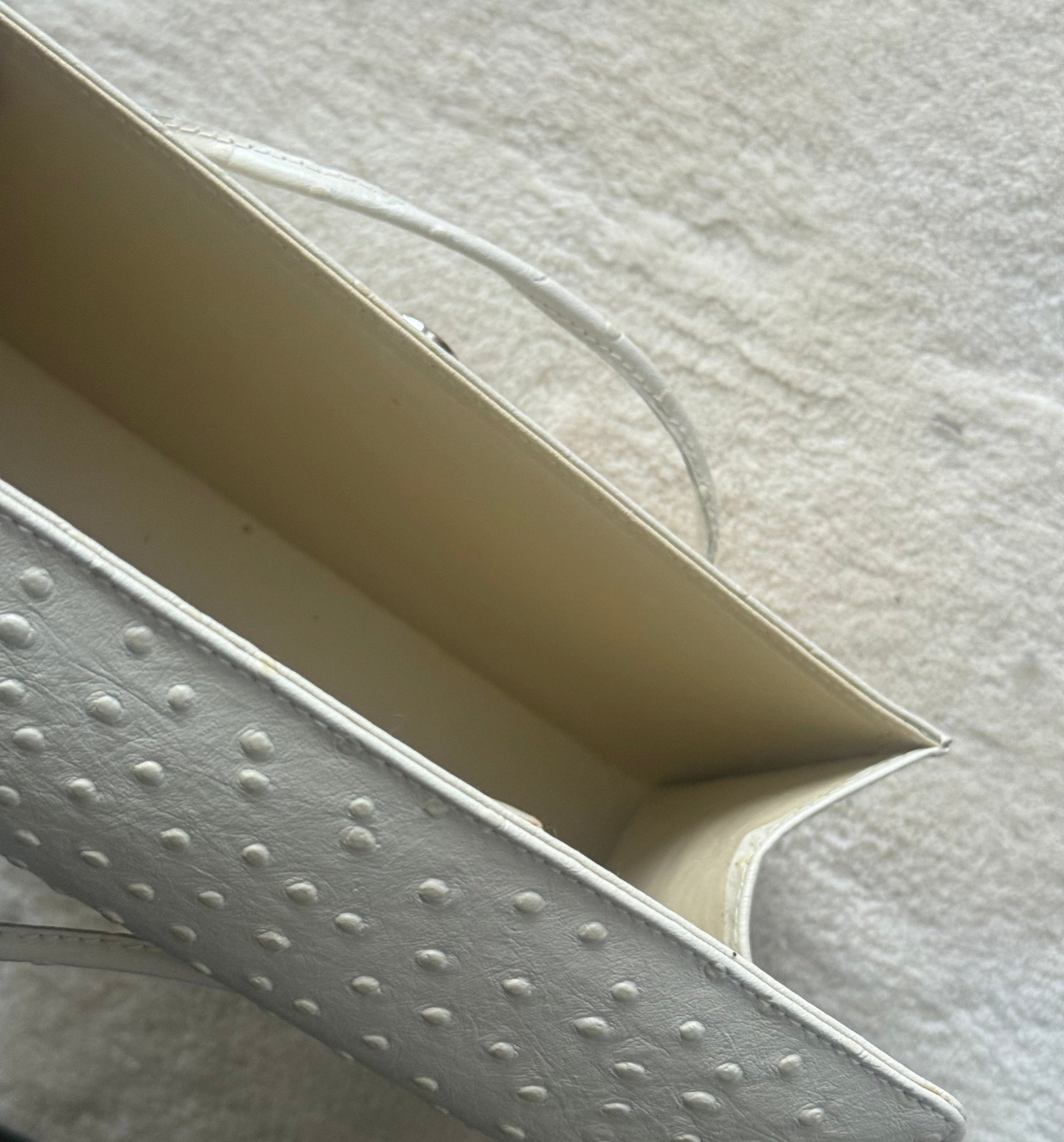 Vintage ostrich leather handbag. This quality genuine leather bag is timeless in design and elegance. It is in great condition with minor wear inside.