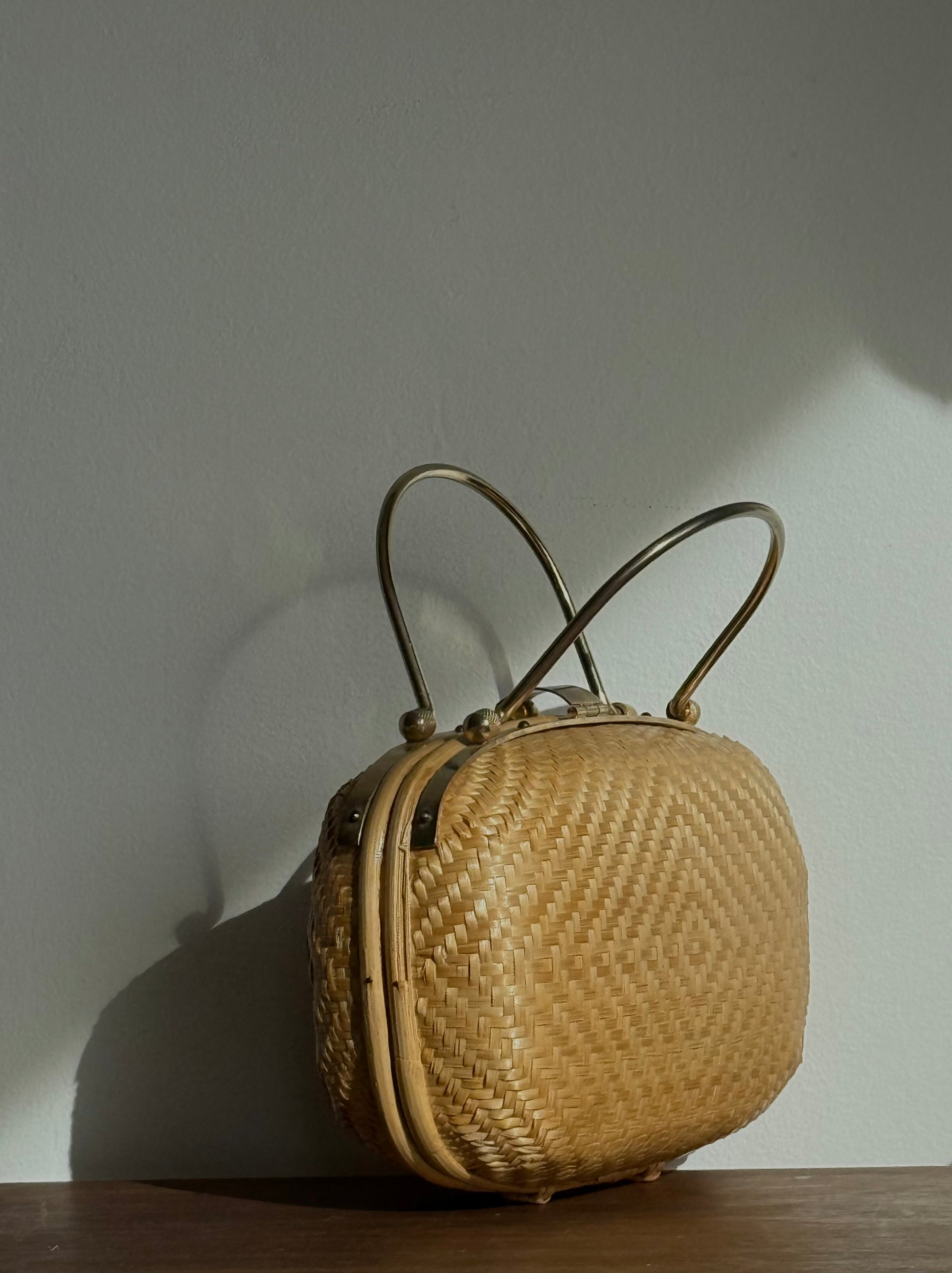 Vintage wicker, rattan with brass Latch And Handles. This woven handbag has beautiful details! The bag is in excellent vintage condition, has a silk lining that has light wear.
