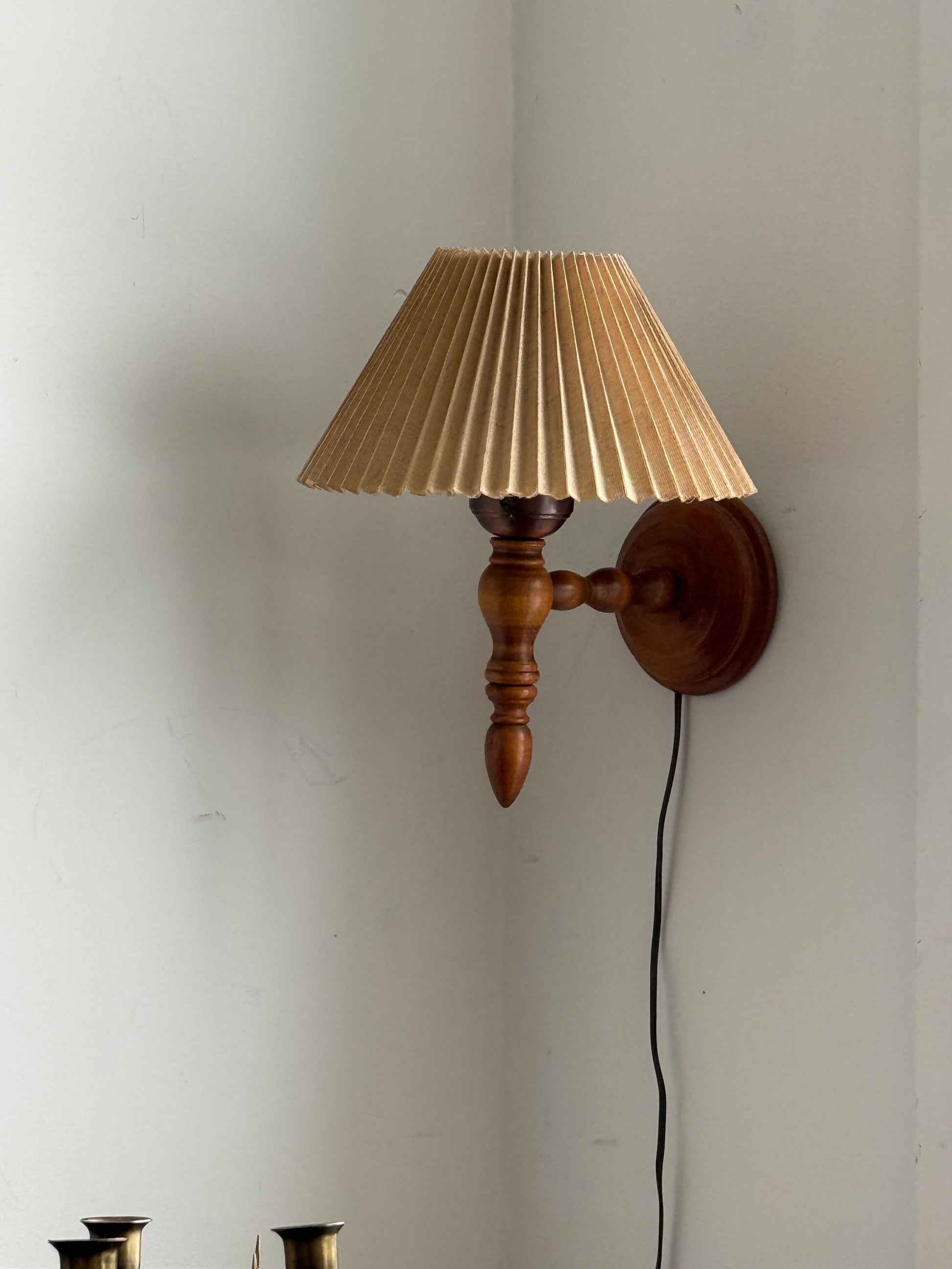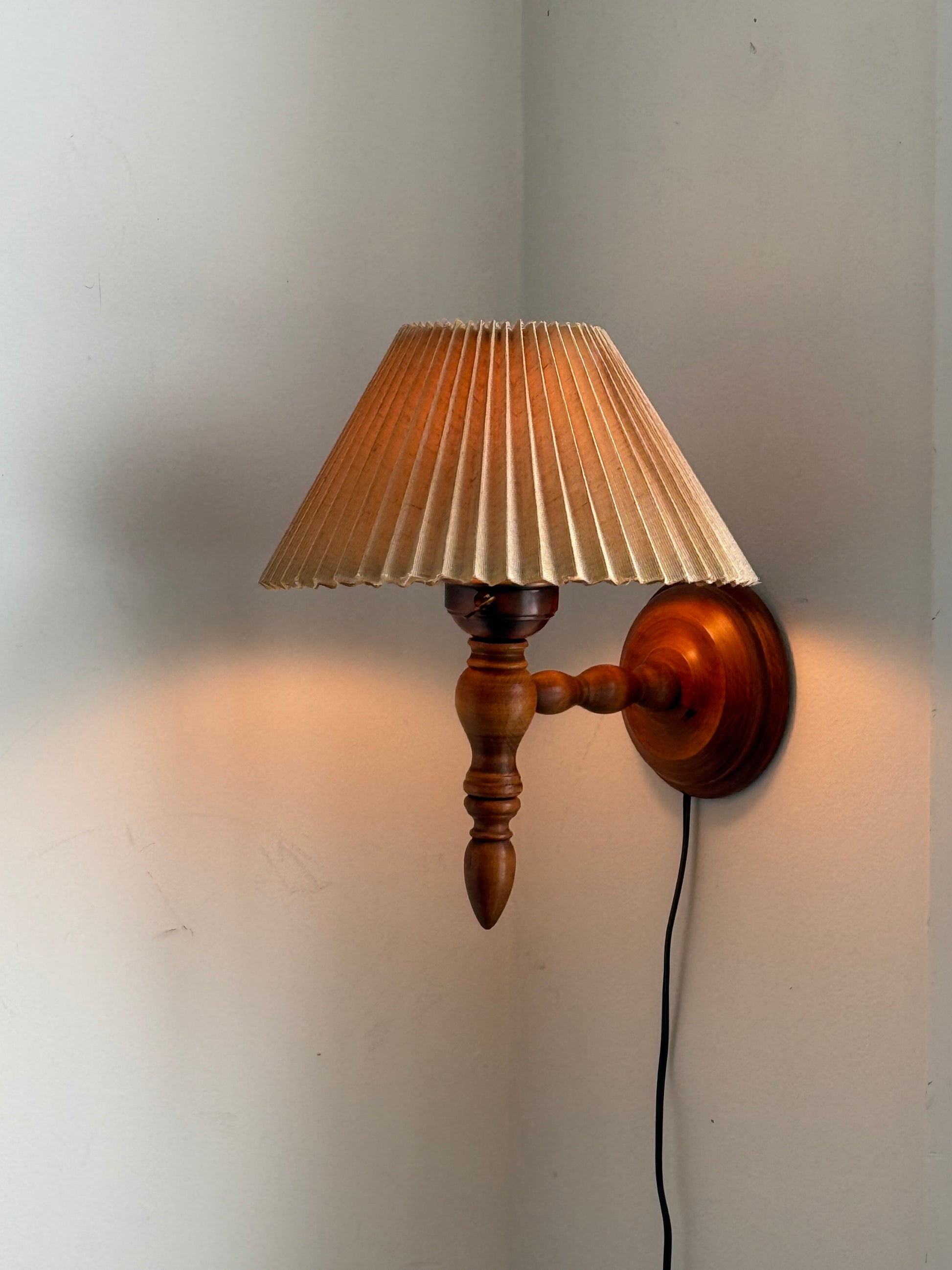 Vintage wooden sconce with a curated pleated shade, the shade has some minor wear, overall great condition.