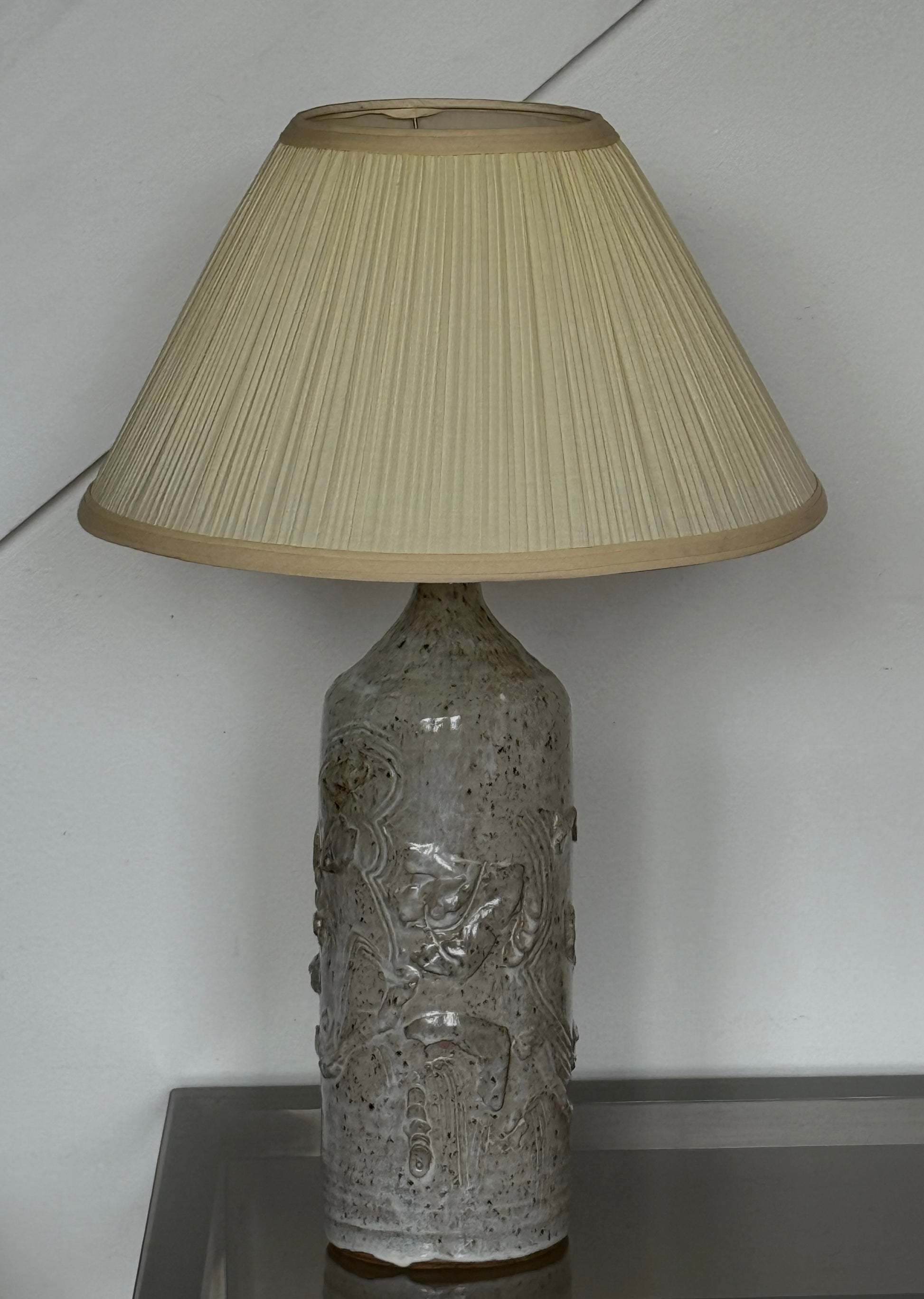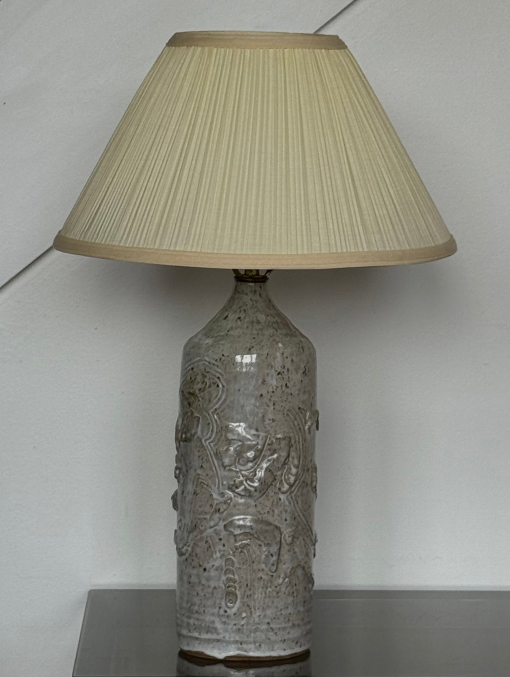 A vintage pottery sculptural speckled lamp with a curated pleated shade